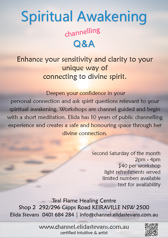 After a short channel guided meditation to clear and align intentions, I will channel guide the Q&A to assist you to sense and practise your personal connection. Channelling allows you to connect deeper with your soul essence, heal wounds beyond time and space and receive personal guidance from your Divine connection.